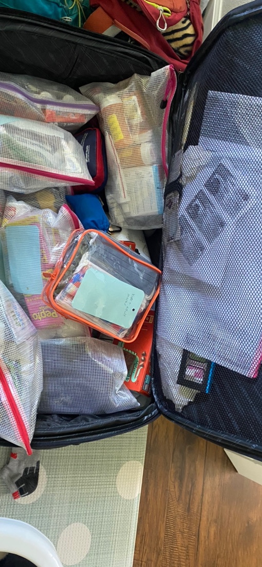 We are less than 2 weeks from our big adventure. I’ve been packing for months but now is time to get more organized. This is our biggest suitcase (medium size). It will carry all the toiletries, meds, shoes, etc. I bought these amazing waterproof zipper bags on Amazon to help separate things into categories, and then put an index card in each bag with a list of all that is in it. I put blue painter’s tape on top of the bag writing the items that still need to go in the bags (to be bought or last minute). This prevents me from packing and repacking and forgetting what I already packed. Mama Middle Aged brain, you know?